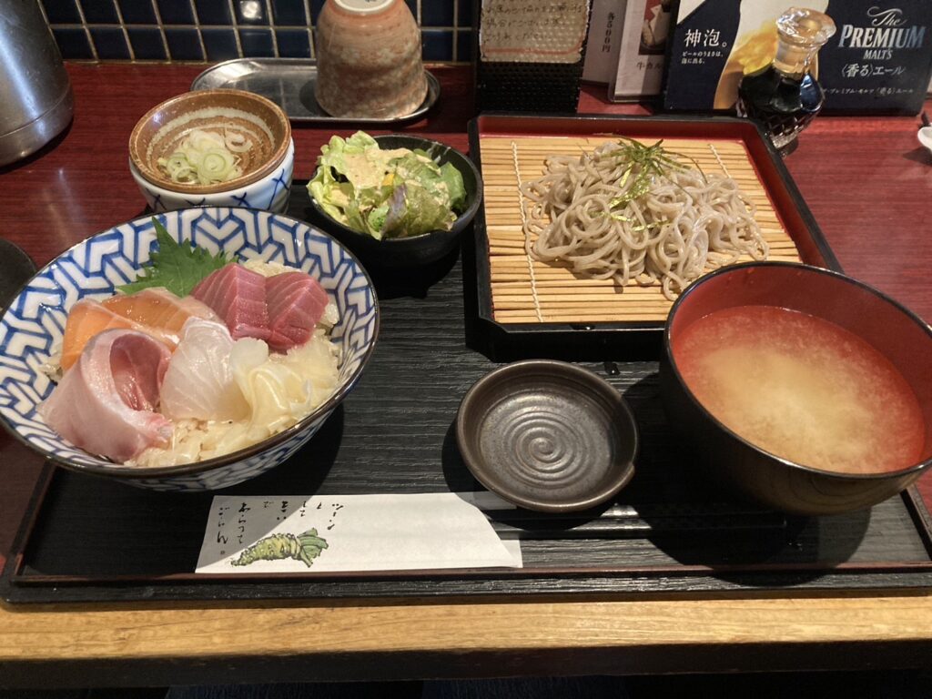私は海鮮丼とざるそばのセットを注文しました!