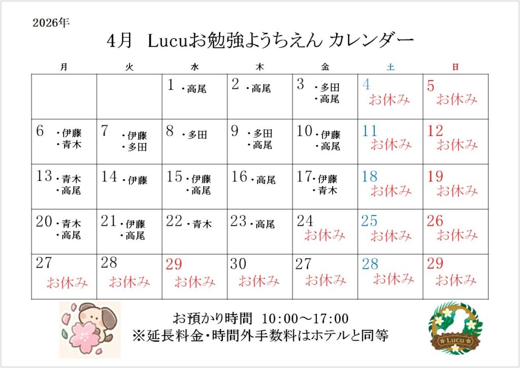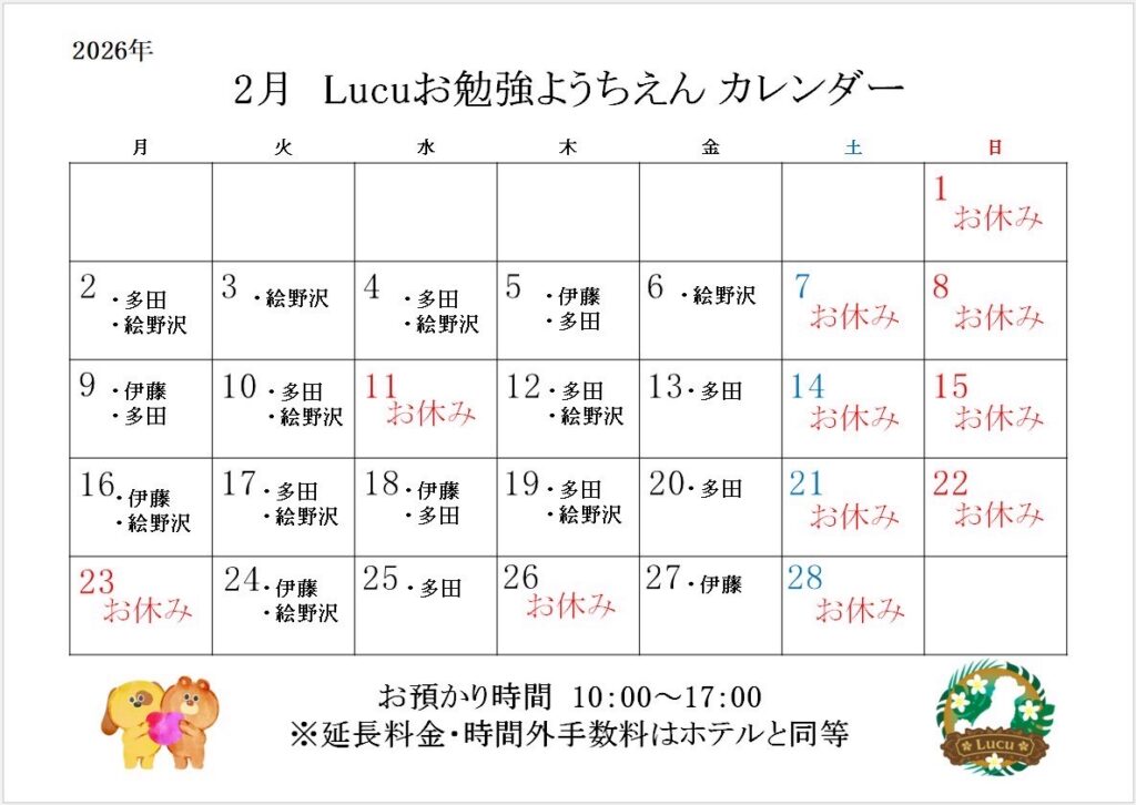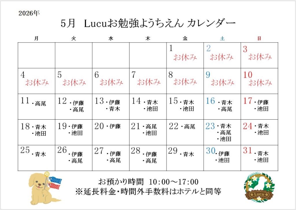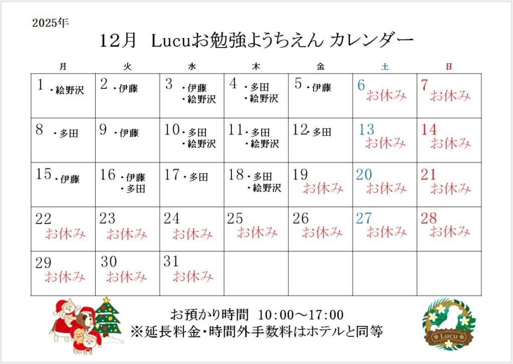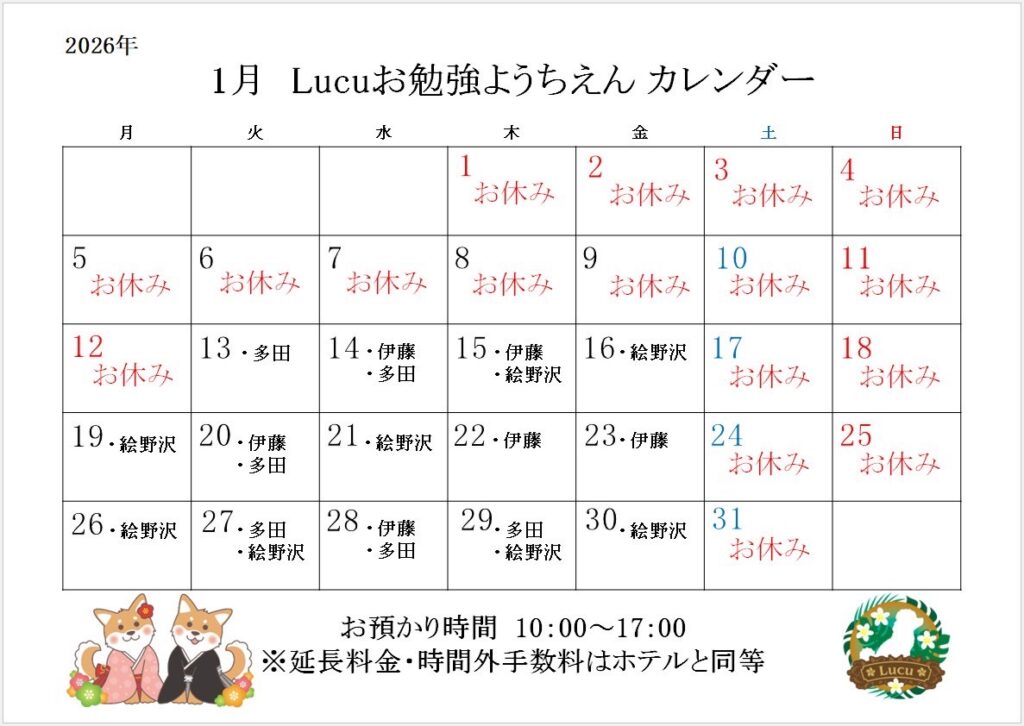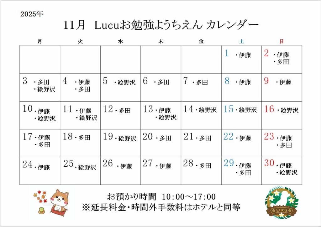 Lucuのいぬのようちえんは、犬の幼稚園・犬の学校・犬のしつけ教室・1日お預かりとして、9:00~18:00(お勉強コースは10:00~17:00)までお預かりをしております。送迎も承っておりますので、お仕事などで忙しいママさん、パパさんの味方です!
